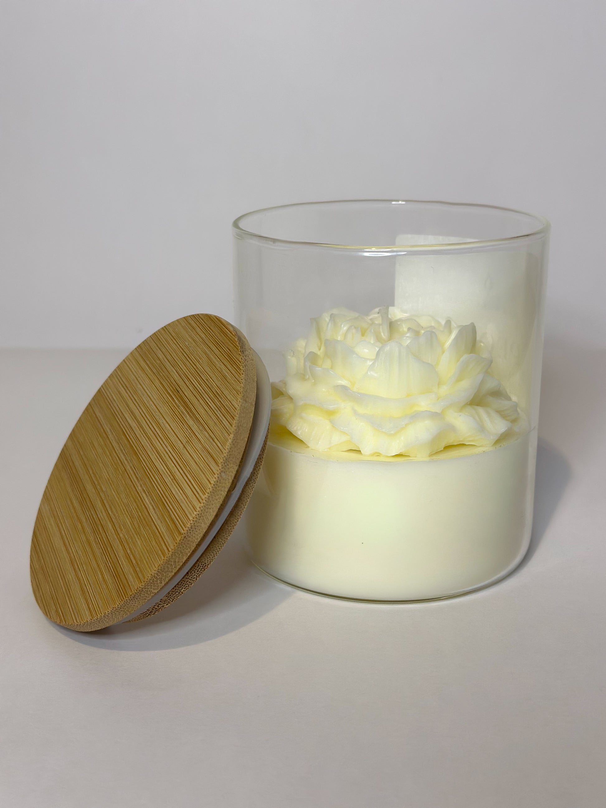 Hand-poured with care, our Floral jar candle combines elegance with warmth. Each candle is crafted from a luxurious blend of mineral and soy waxes, chosen for their smooth finish, clean melt, and excellent scent throw. Topped with a delicate wax flower, it’s as beautiful unlit as it is when glowing.